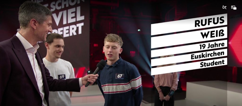 Ein junger Mann kommt zu Wort: „Die gleichen Leute kontrollieren Europa, Russland, USA, und die wollen, dass Krieg ist, um uns Angst zu machen. Der Krieg ist nur Show, um uns Angst zu machen.“ Tagesschau-Moderator Ingo Zamperoni leitet die Sendung und fragt nach, woher diese Ansicht komme. „Wer seinen eigenen freien Willen nutzt,“ sagt Rufus Weiß, 19 Jahre, Student aus Euskirchen, „kann sich selbst informieren und nicht nur glauben, was die Medien sagen. Die Medien sind nicht dazu da, zu informieren.“