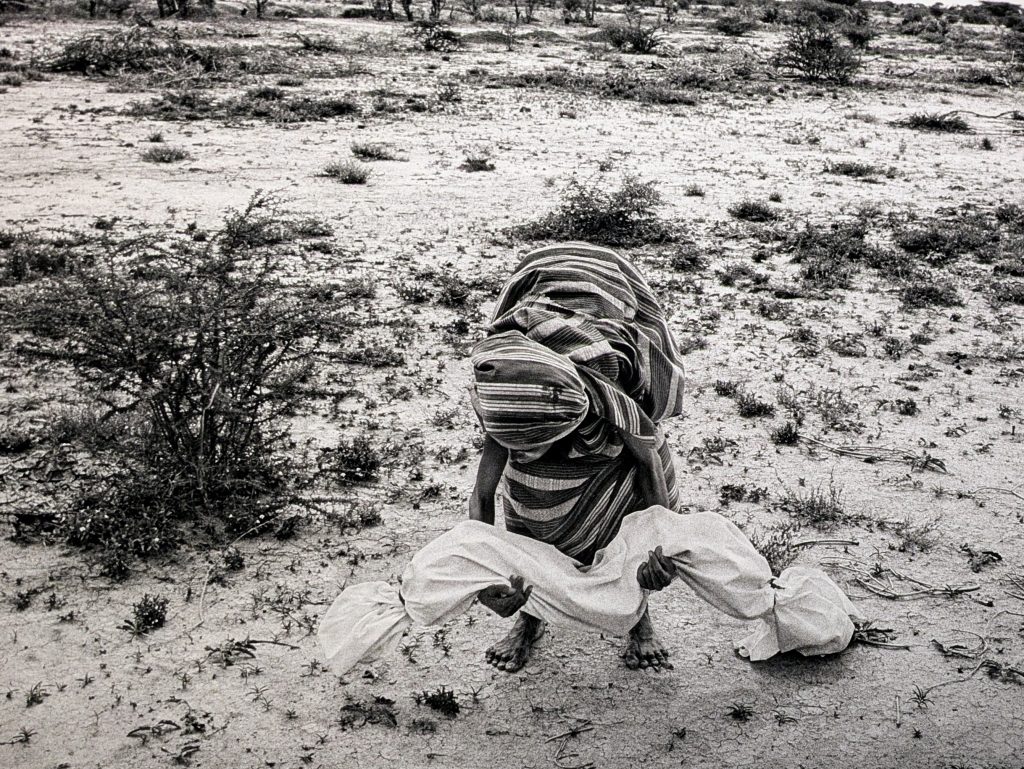 Bardera, Somalia 1992: „Eine Mutter nahm ein Kind auf den Arm, das an Hunger gestorben ist, um es zum Grab zu tragen“ (Originalfoto von James Nachtwey, abfotografiert und Text übernommen in der Ausstellung „Memoria“, Museum Fotografiska Berlin)